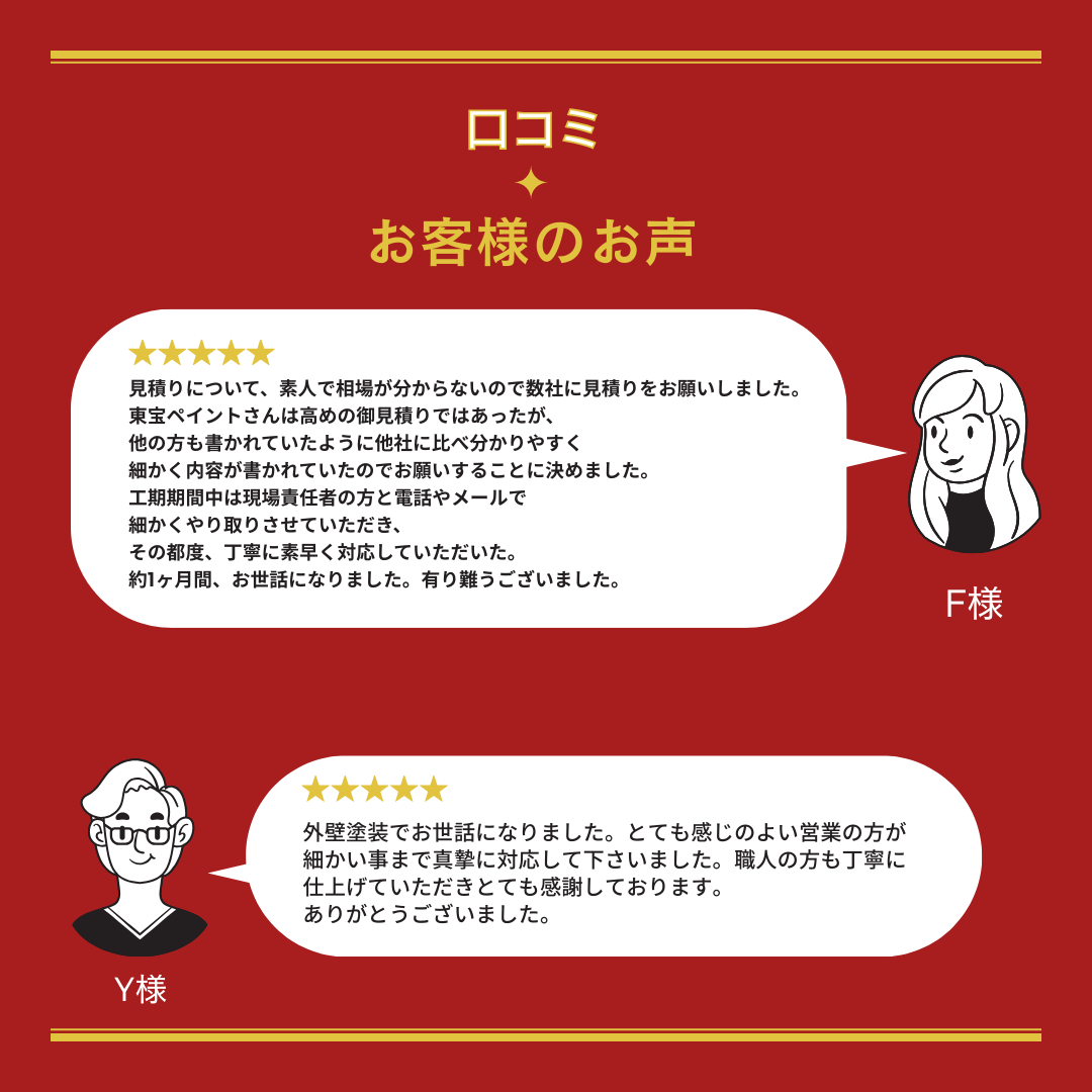 今回は、実際に東宝ペイントで塗装工事を行ったお客様から、口コミをお寄せいただいた2名のお声をご紹介します。